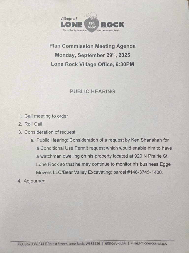 The Plan Commission will be meeting on Monday, September 29th at 6:30PM to discuss a Conditional Use Permit application for a local business located on HWY 14 in the Village of Lone Rock.
