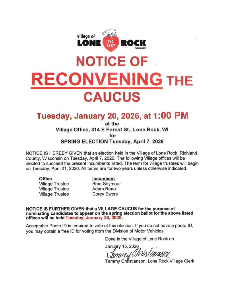 Posted on January 15, 2026 by treasurer RECONVENING THE CAUCUS NOTICE OF RECONVENING THE CAUCUS TUESDAY, JANUARY 20TH, 2026 @ 1:00 PM LONE ROCK VILLAGE OFFICES